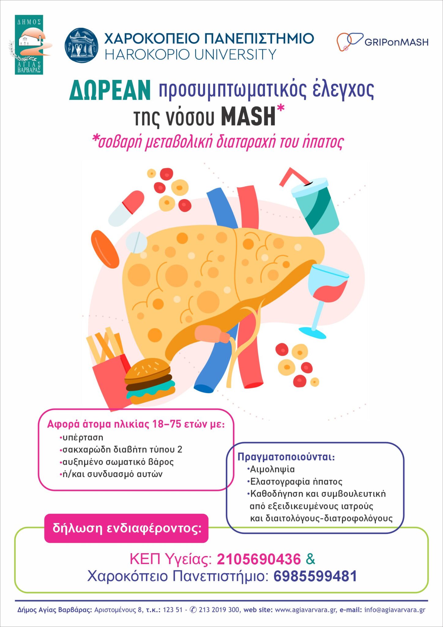 Ο Δήμος Αγίας Βαρβάρας συνεργάζεται με το Χαροκόπειο Πανεπιστήμιο-Τμήμα Διατροφής-Διαιτολογίας, για την υλοποίηση του Ευρωπαϊκού προγράμματος «Παγκόσμια ερευνητική προσπάθεια για τον έλεγχο των ασθενών με MASH / GRIP on MASH: Global Research Initiative for Patient Screening on MASH», με επιστημονικό υπεύθυνο τον κύριο Γεώργιο Δεδούση, Καθηγητή Μοριακής Γενετικής και Διατροφογενετικής.