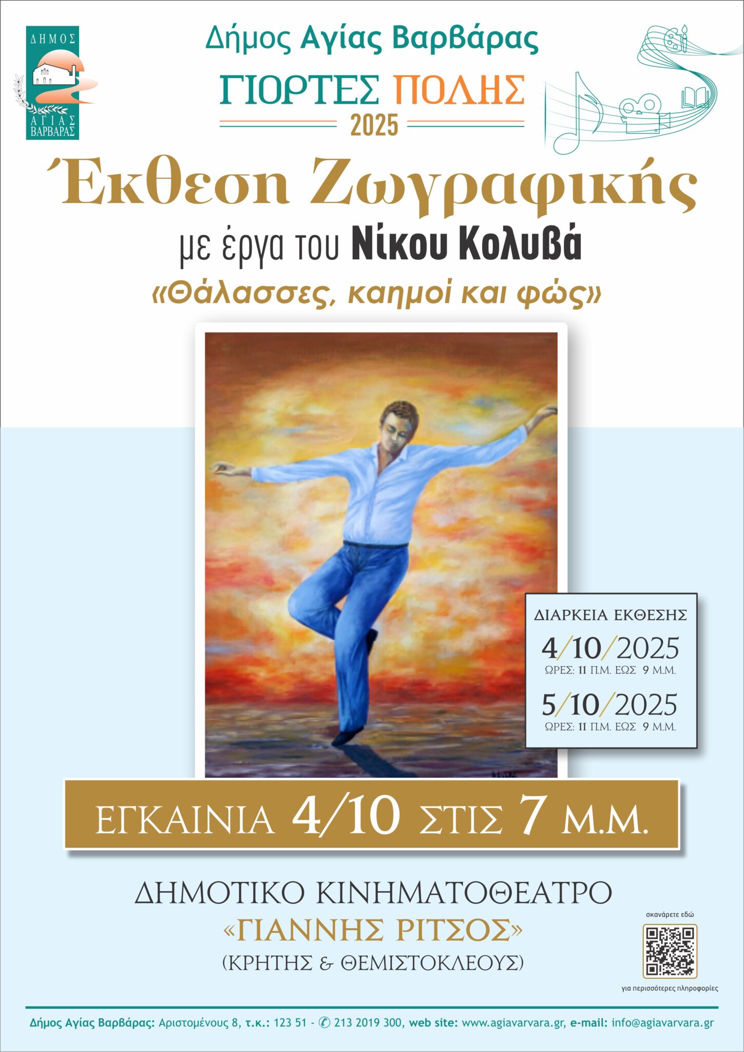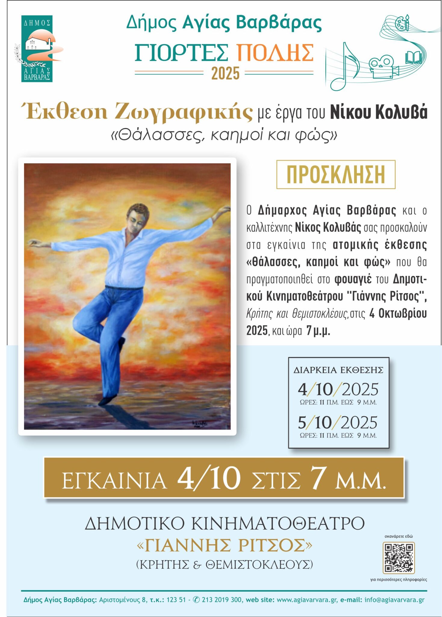 Ο Δήμος Αγίας Βαρβάρας σας προσκαλεί όλες και όλους, μαζί να ανακαλύψουμε την ξεχωριστή καλλιτεχνική ιδιοσυγκρασία και δημιουργία του Νίκου Κολυβά, μέσα από τα έργα του ζωγραφικής!
