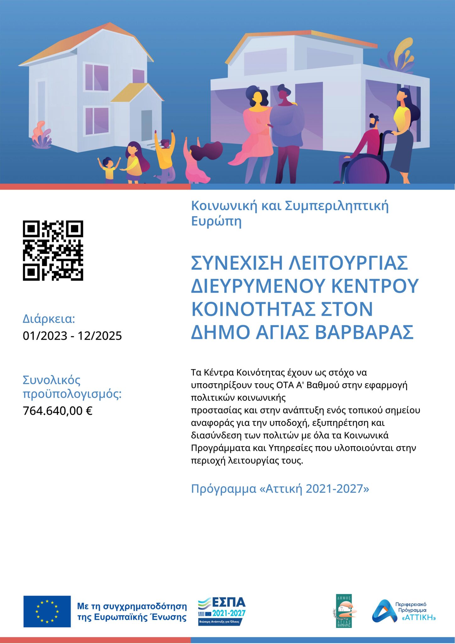 Η λειτουργία του Κέντρου Κοινότητας στον Δήμο Αγίας Βαρβάρας ξεκίνησε τον Δεκέμβριο 2017 με χρηματοδότηση από το Περιφερειακό Επιχειρησιακό Πρόγραμμα «Αττική 2014-2020» και συνεχίζεται στο ΕΣΠΑ 2021-2027 μέσω του προγράμματος «Αττική 2021-2027» και συγχρηματοδότηση από το Ευρωπαϊκό Κοινωνικό Ταμείο.