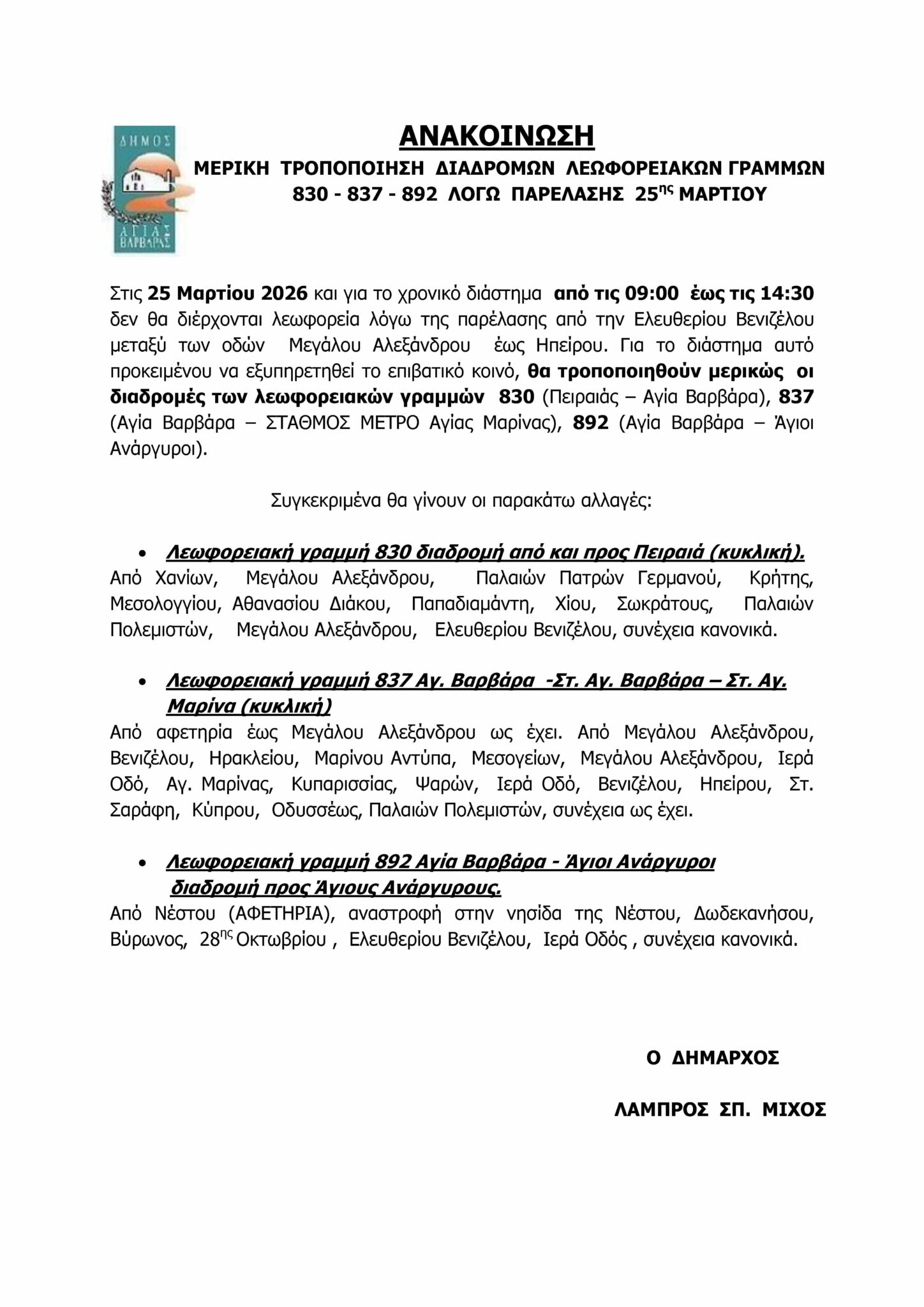 Στις 25 Μαρτίου 2026 και για το χρονικό διάστημα από τις 09:00 έως τις 14:30 δεν θα διέρχονται λεωφορεία λόγω της παρέλασης από την Ελευθερίου Βενιζέλου μεταξύ των οδών Μεγάλου Αλεξάνδρου έως Ηπείρου. Για το διάστημα αυτό προκειμένου να εξυπηρετηθεί το επιβατικό κοινό, θα τροποποιηθούν μερικώς οι διαδρομές των λεωφορειακών γραμμών 830 (Πειραιάς – Αγία Βαρβάρα), 837 (Αγία Βαρβάρα – ΣΤΑΘΜΟΣ ΜΕΤΡΟ Αγίας Μαρίνας), 892 (Αγία Βαρβάρα – Άγιοι Ανάργυροι).