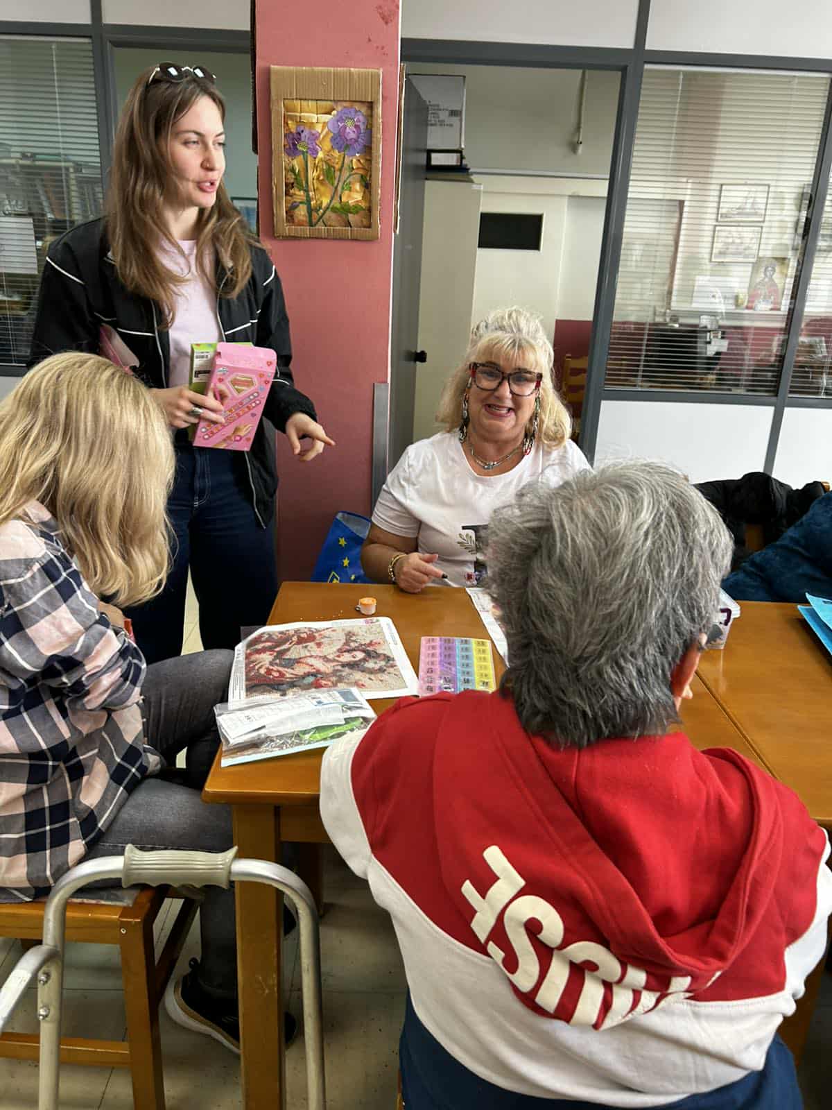 Ωφελούμενοι του Παραρτήματος ΑΜΕΑ Δυτικής Αττικής, άνθρωποι που ζουν μόνιμα εκεί λόγω προβλημάτων με την υγεία τους και έλλειψης υποστηρικτικού οικογενειακού περιβάλλοντος, επισκέφθηκαν το Α ΚΑΠΗ. Σε ένα ιδιαίτερα ζεστό και φιλικό περιβάλλον, πίνοντας όλοι μαζί τον καφέ τους, γνωρίστηκαν και συνομίλησαν με τους ηλικιωμένους και με την ενθάρρυνση των μελών, έφτιαξαν τις δικές τους εικαστικές κατασκευές.