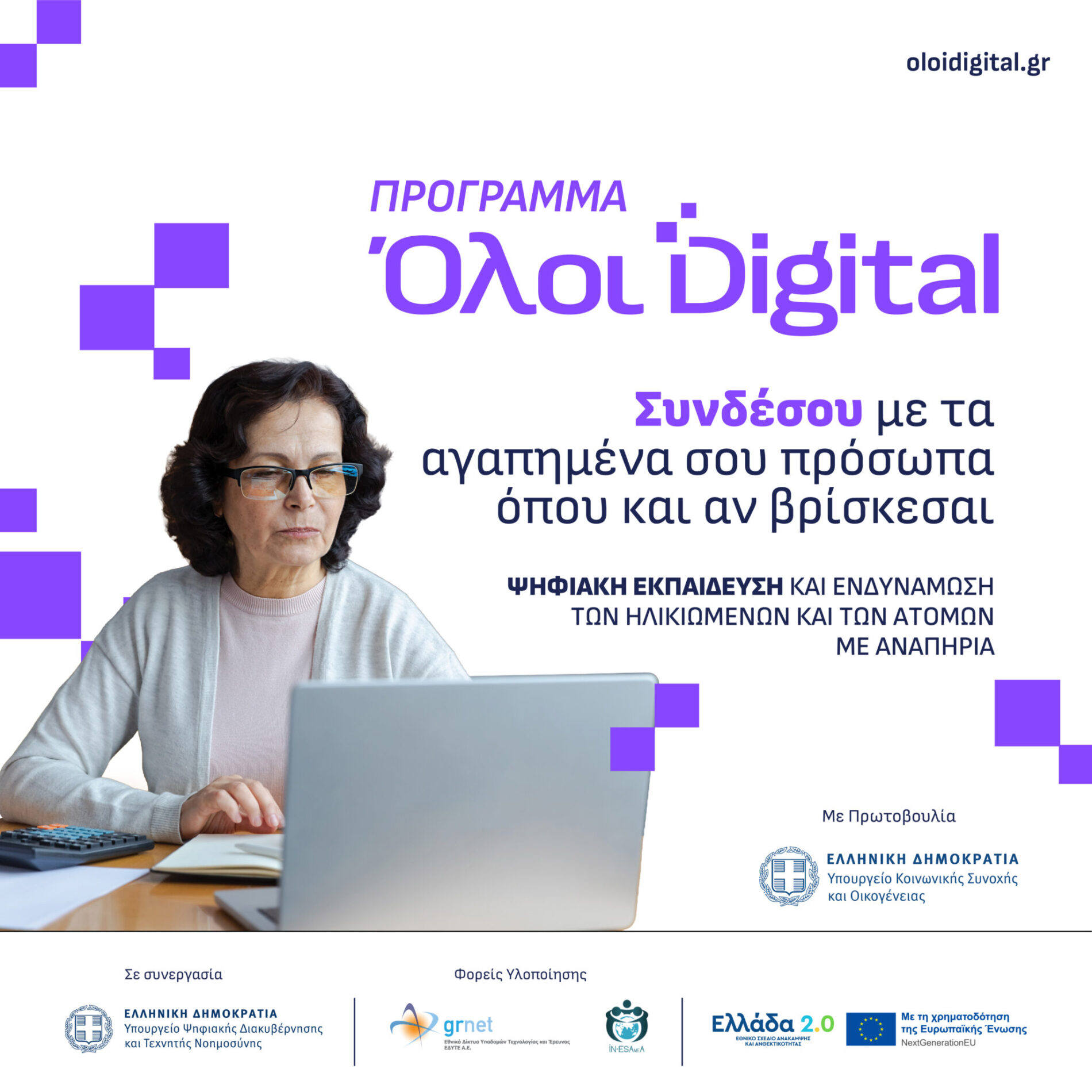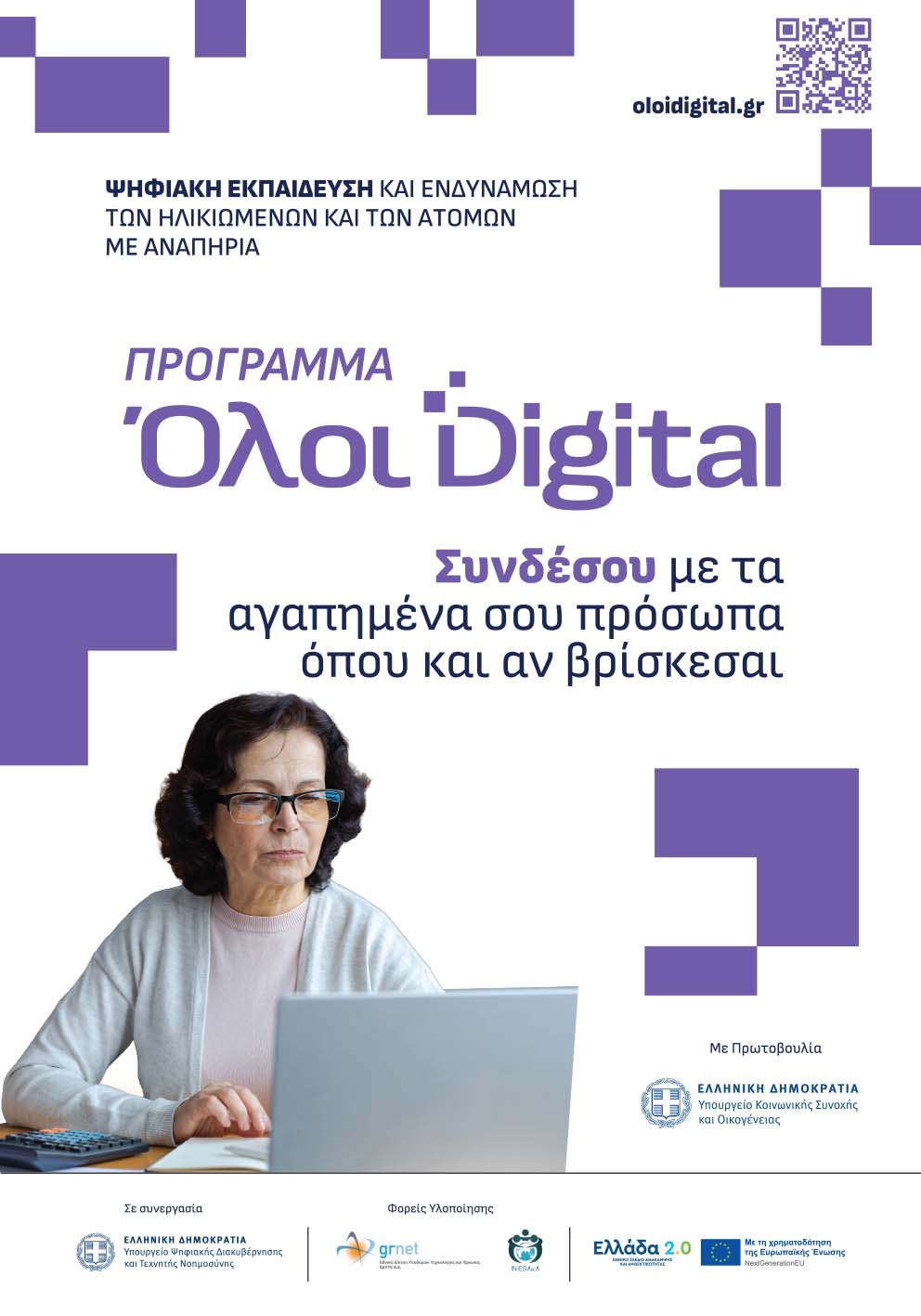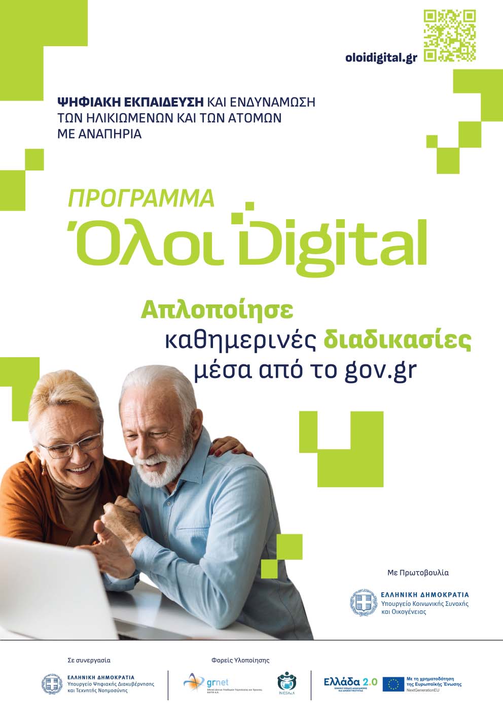 Ξεκίνησαν οι αιτήσεις για το Πρόγραμμα Ψηφιακής Ενδυνάμωσης των Ηλικιωμένων (65 χρόνων και άνω). Πρόκειται για πρόγραμμα εκμάθησης και εξοικείωσης των ηλικιωμένων με τη χρήση ηλεκτρονικών υπολογιστών και άλλων ψηφιακών μέσων.