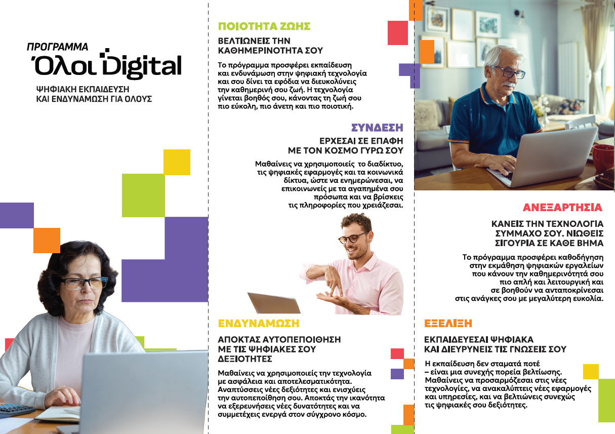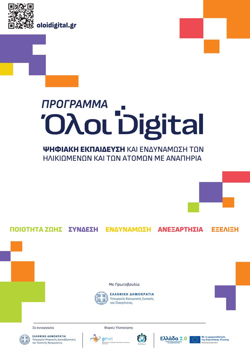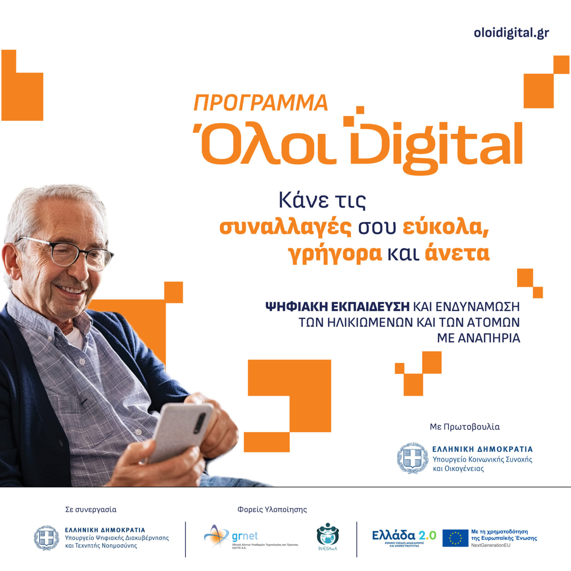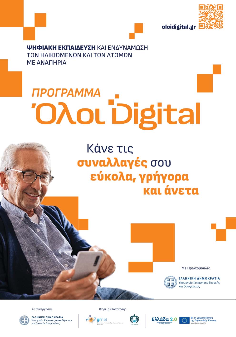 Ξεκίνησαν οι αιτήσεις για το Πρόγραμμα Ψηφιακής Ενδυνάμωσης των Ηλικιωμένων (65 χρόνων και άνω). Πρόκειται για πρόγραμμα εκμάθησης και εξοικείωσης των ηλικιωμένων με τη χρήση ηλεκτρονικών υπολογιστών και άλλων ψηφιακών μέσων.