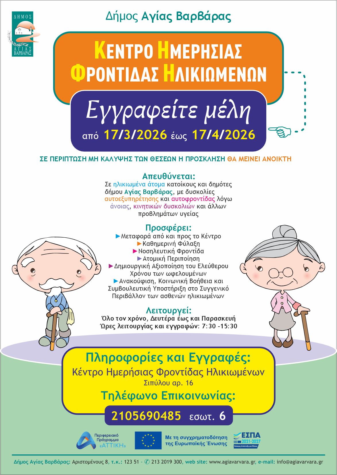 Περισσότερες πληροφορίες: ΚΗΦΗ Δήμου Αγίας Βαρβάρας: Σιπύλου αρ. 16, 2105690486, εσωτ. 6.